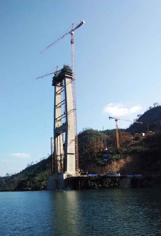 紅水河特大橋兩側(cè)橋墩高度均為210米,每個橋墩的起重機(jī)械配置均為川建生產(chǎn)的一臺C7036塔機(jī)、一臺C7030塔機(jī)和兩臺SC200/200WPZ中速變頻施工梯,副墩的施工機(jī)械為一臺P125平頭式塔機(jī)。